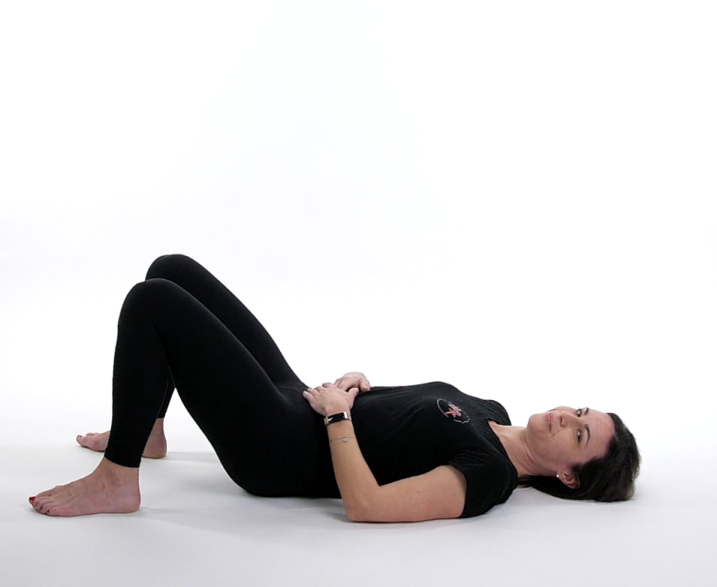 Ogni sera sdraiata a letto (o a terra) con gambe flesse e posizione rilassata. Metti una mano sul tuo addome e una sul torace. Ora inspira con il naso e cerca di immaginare che l’aria vada a gonfiare un palloncino posto a livello della pancia (ovviamente non respiriamo con la pancia, ma quest’ultima sale perché il diaframma attivandosi scende in basso per ampliare la cassa toracica). Aspetta un paio di secondi e in modo passivo, quindi senza contrarre gli addominali, senza soffiare con forza e senza spingere, fai uscire l’aria con la bocca aperta. Cerca di fare questa respirazione nel modo più rilassato possibile, immaginandoti magari in un bel posto in vacanza 🙂