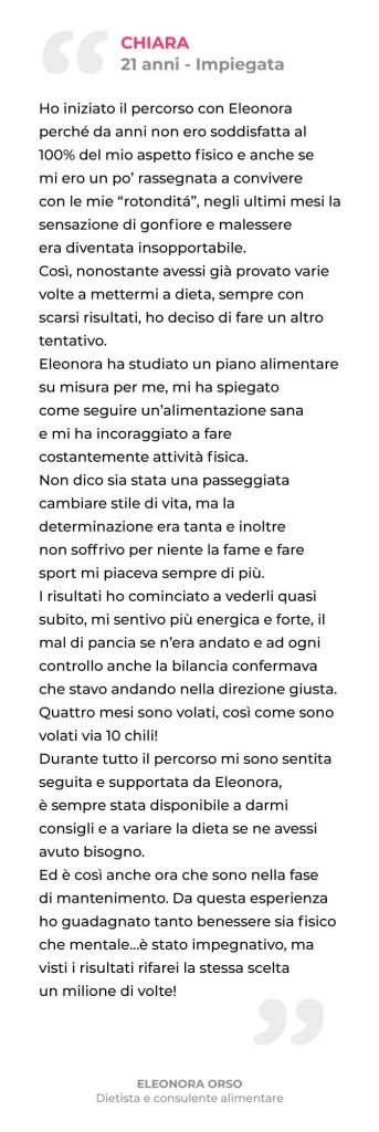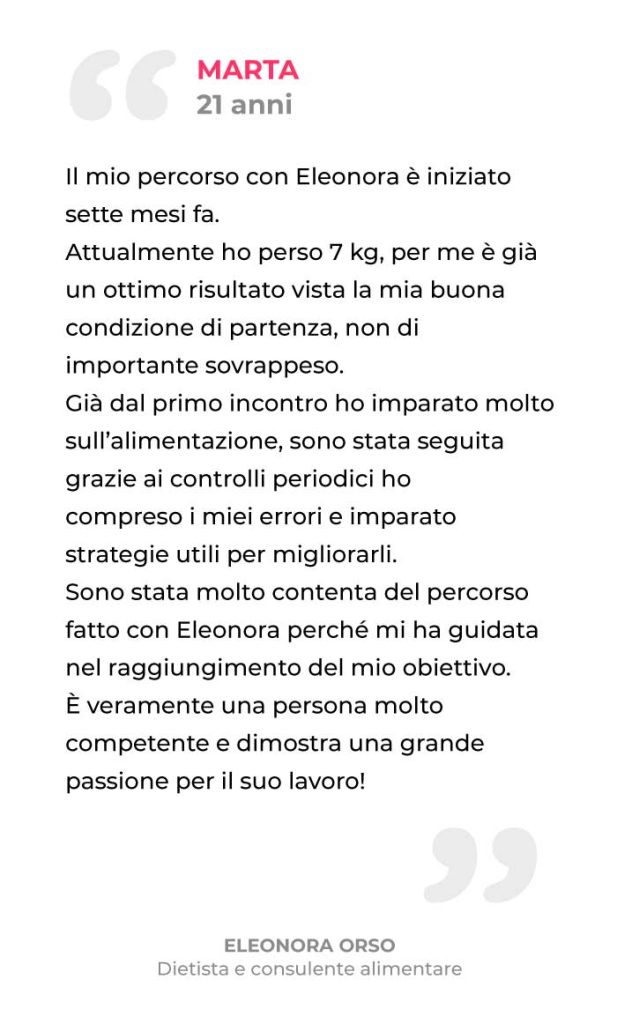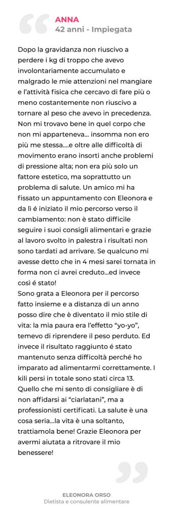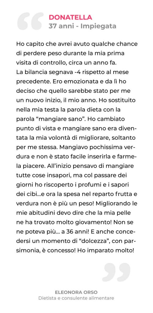 In questo modo la dottoressa potrà “aggiustare il tiro” su eventuali difficoltà che potresti avere, sui tuoi gusti personali e sul tuo stile di vita. Il tutto finalizzato a rendere il piano davvero cucito su misura per te.